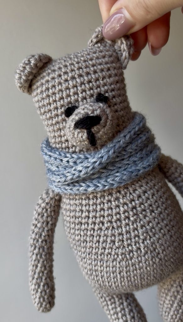 The bear is crocheted from the bottom up in continuous rounds. The arms are crocheted separately and joined to the body as you work. The muzzle and ears are crocheted separately and sewn on afterward. The eyes and nose are embroidered.