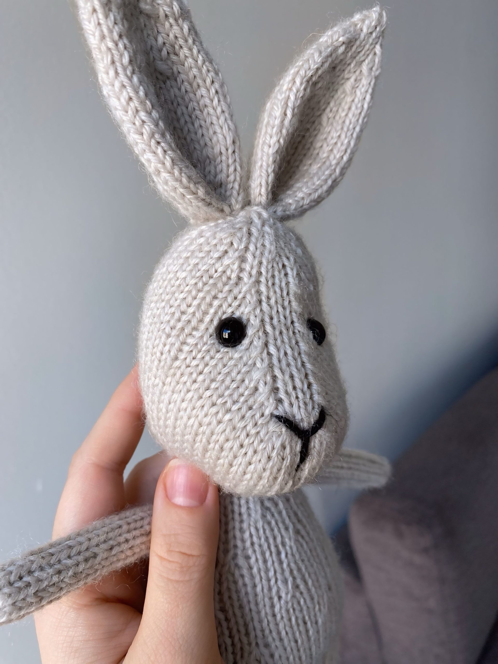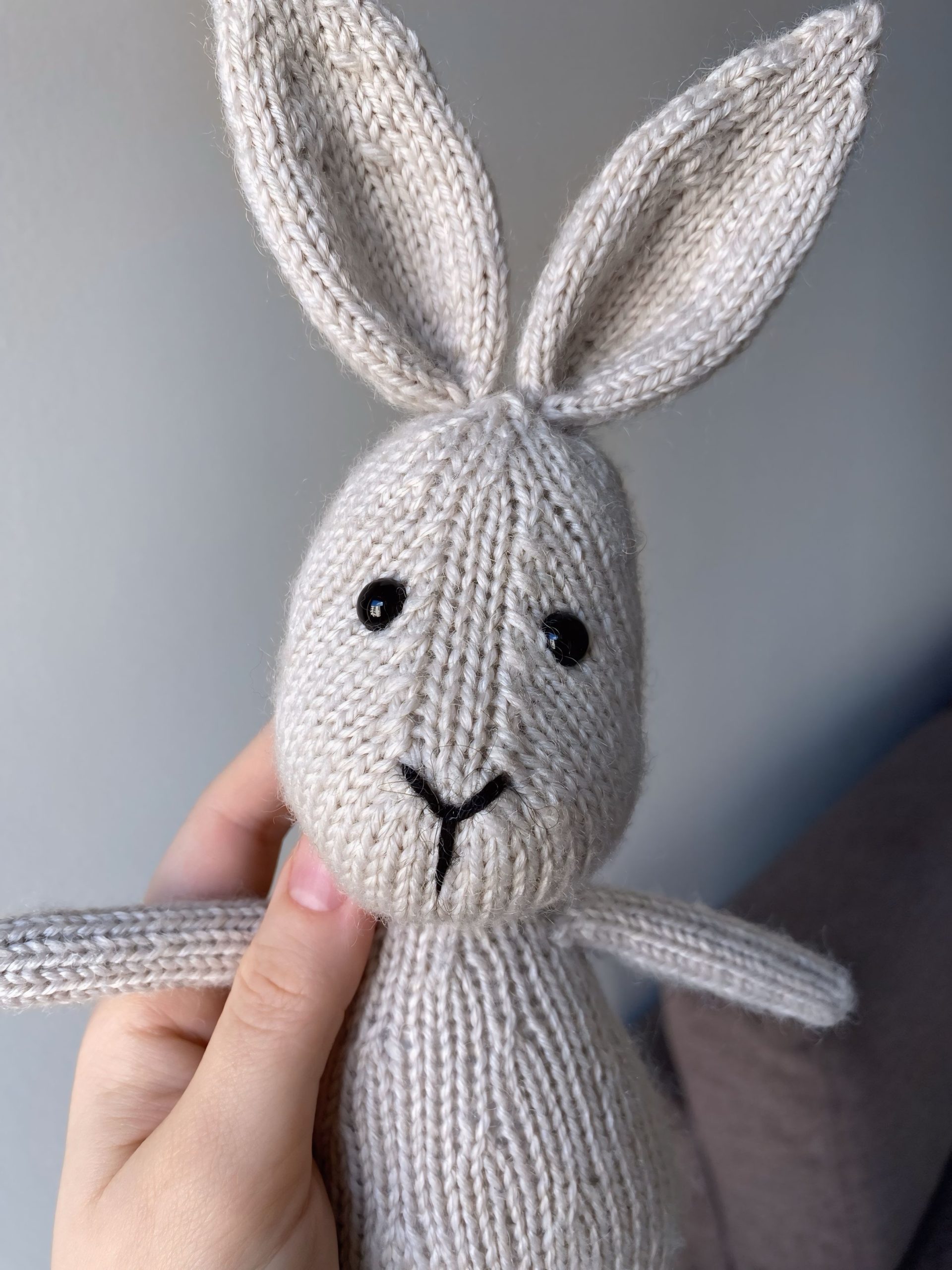 The bunny is worked in the round from the bottom up as one continuous piece, starting from the legs and ending at the head. The arms are made separately and joined to the body as you go. The ears are knitted separately and sewn on. Safety eyes are used for the eyes, and the nose is embroidered with black yarn.