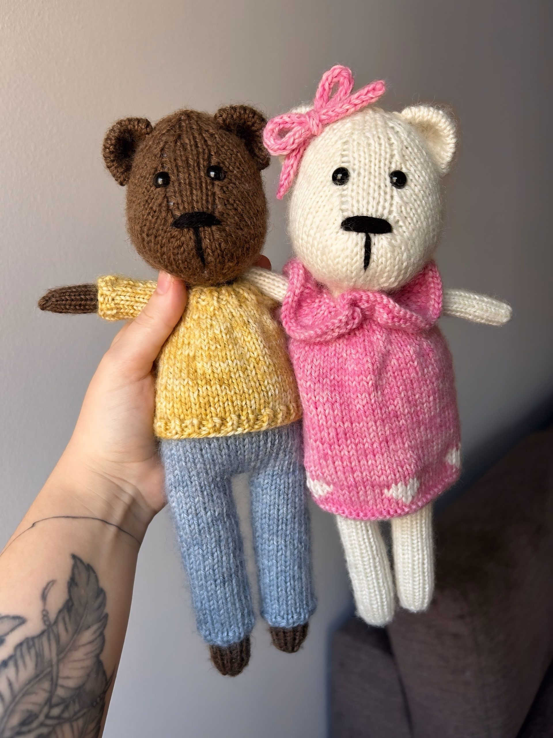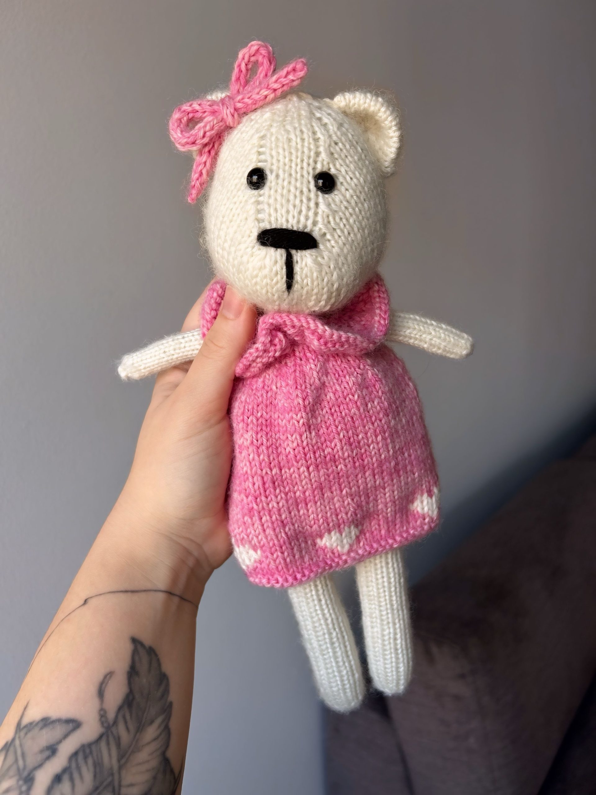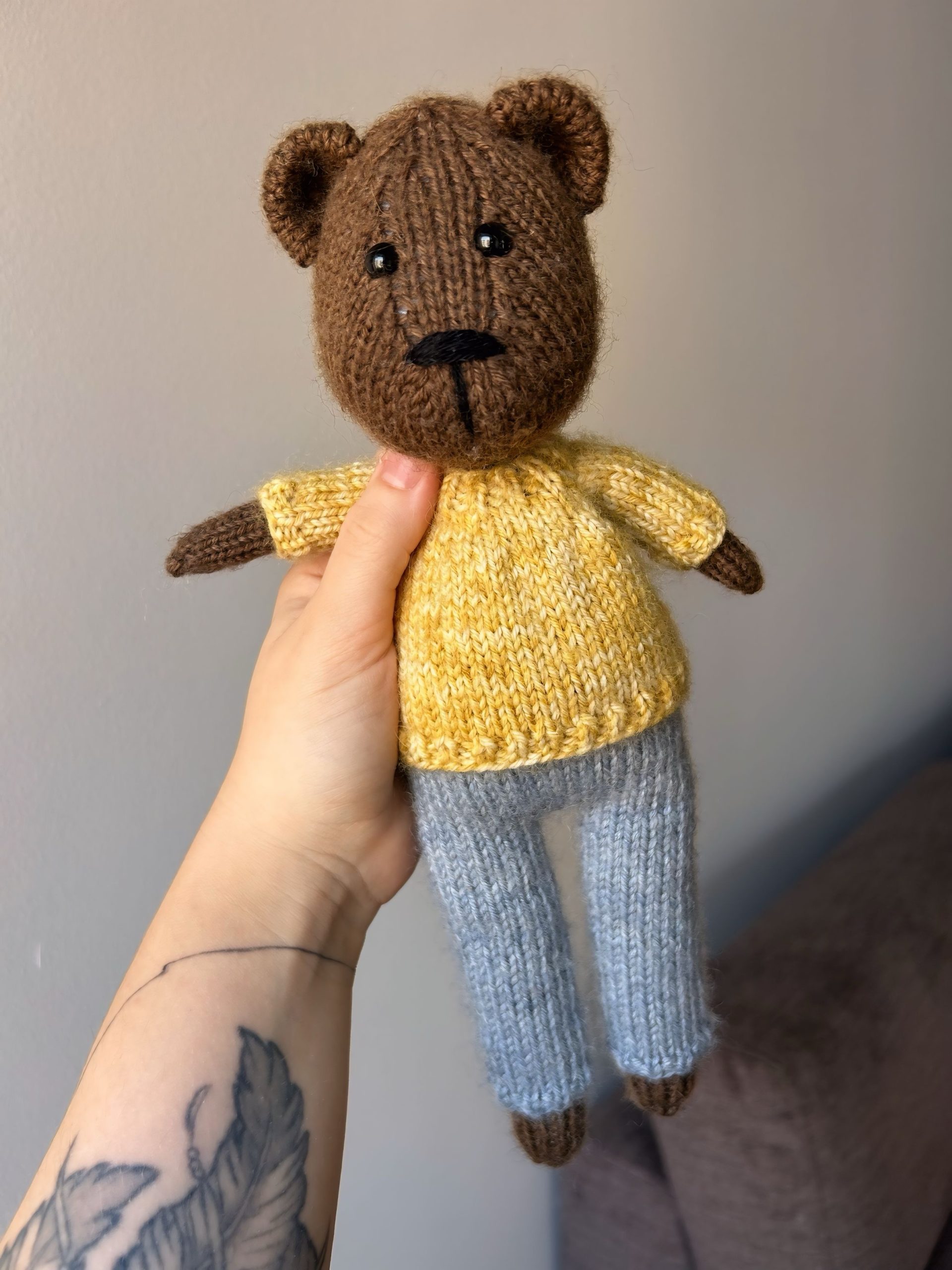 Dress up your handmade toy with this adorable set of clothing patterns (overalls, pants, sweater and dress) made to perfectly fit your knitted My Whimsy Toy. (toy pattern NOT included).