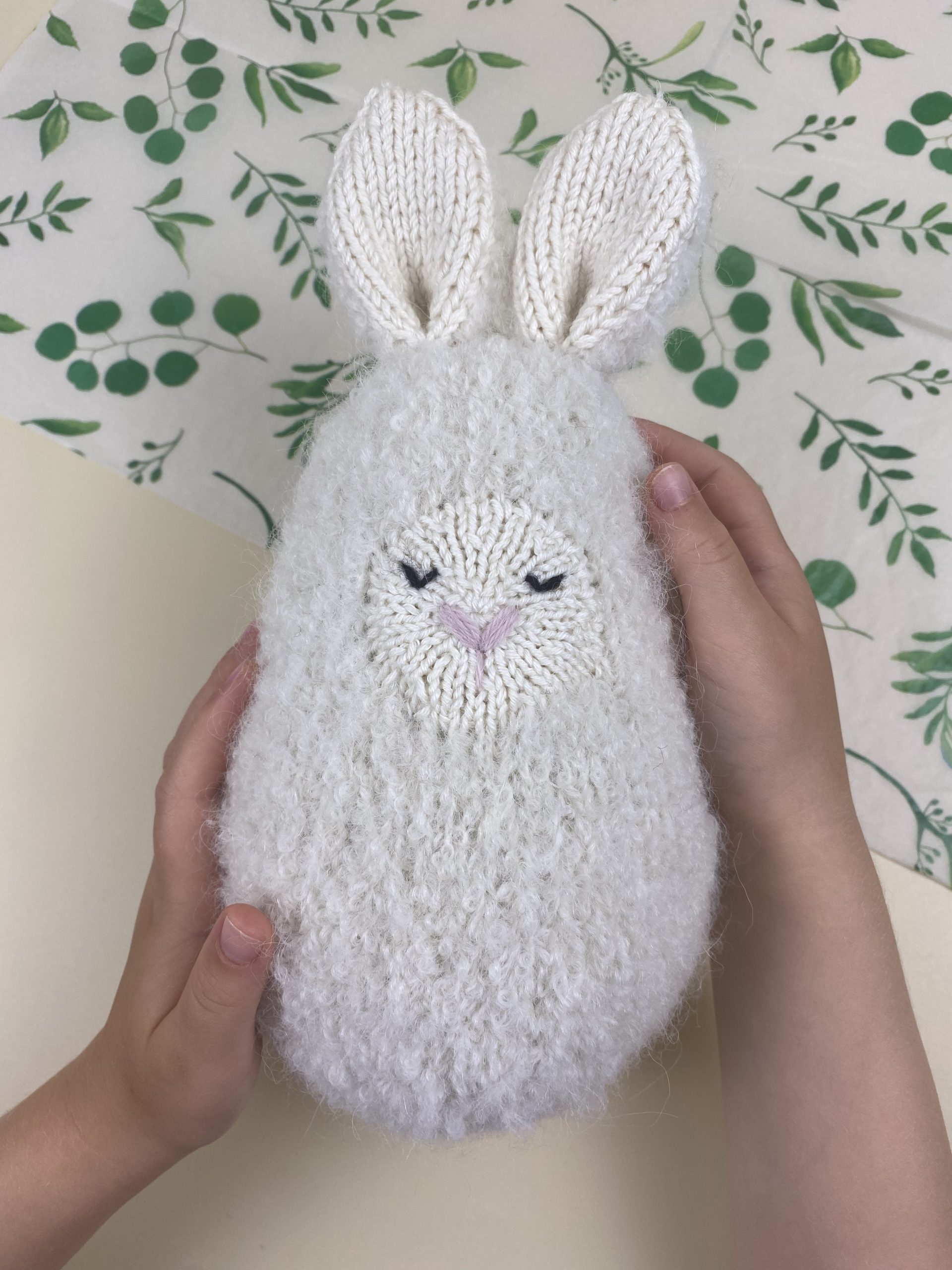 The Bunny is knitted bottom-up in the round. The ears and snout are knitted separately and sewn on. The eyes and nose are embroidered